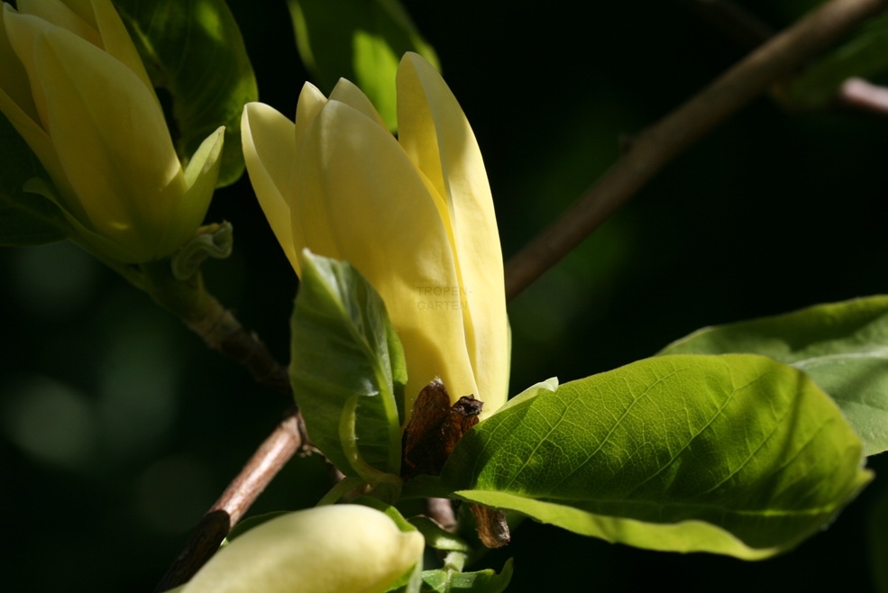 Die Blüten erscheinen vor oder mit den Laubblättern, sind 6–9 cm im Durchmesser, leicht duftend und haben grünliche bis gelbliche (als einzige Art der Gattung) oder orangefarbene Perigonblätter. Schon während der Blühphase sind die länglich-zylindrischen, oft gekrümmten, 2–7 cm langen und bis 2,7 cm breiten Sammelbalgfrüchte, wie sie typisch für die Gattung Magnolia L. sind, gut erkennbar. Je Fruchtblatt finden sich 1–2 herzförmige, 9–10 mm lange Samen mit rotem Samenmantel (Arillus).
