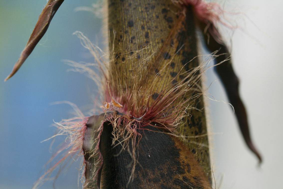 Die Art errreicht Höhen von 3–17 m, an idealen Standorten mit hoher Jahreswärmesumme und ausreichend Feuchtigkeit sogar bis 27 m. Die Pflanzen zeigen eine ausgeprägte Neigung zur Ausläuferbildung, die teilweise viele Meter von den zentralen Sprossen neue Halme bilden. Die Halme haben einen Durchmesser von 4–30 cm, sind grün, oft orangefarben unterlaufen, anfangs weiß pudrig bereift und an den Internodien weich behaart, später kahl. Neue Sprosse sind dunkelbraun bis olivfarben, oft schwarz gepunktet ("getigert"), an den weich behaarten Halmscheiden finden sich lange, rote bis gelbe, strohartige Wimpern und lange, schmal lanzettliche, zungenförmige, dunkelbraune Spitzen. Die Laubblätter sind grün, 5–12 cm lang, bis 2 cm breit, ganzrandig und an der Blattscheide dunkelbraun behaart.