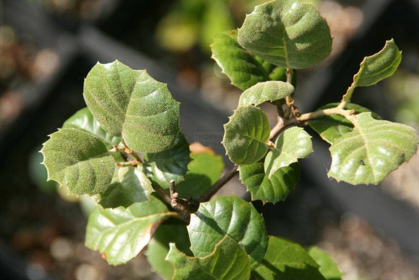 Quercus alnifolia ist eine immergüne Eiche aus Zypern mit dekorativen, rundlichen, erlenartigen Blättern. Zypriotischer Nationalbaum. Sicher hart bis Z 8.