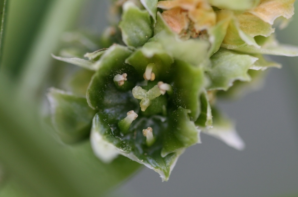 Der Blütenstand ist aufrecht, 2,5–14 cm lang, mit 1–15 cm langem Stiel. Oben finden sich mehrere sterile Hüllblätter. Fertile Hüllblätter sind grün und 4–7 mm lang. Die Blütenhülle ist anfangs grün, später rötlich-orangefarben, glockenförmig und 5–7 mm im Durchmesser groß. Die Perigonblätter sind eiförmig, 3–5 mm lang, 2–4 mm breit und zu einer 2–2,5 mm langen Röhre verwachsen. Die Staubfäden sind 1–2 mm lang, unten verbreitert und mit dem Perigon verwachsen, im oberen Teil gekrümmt. Der Fruchtknoten ist halbkugelig und 2–2,5 mm im Durchmesser groß. Die Narbe ist 3-lappig. Später bilden sich kugelige, purpurrote, 8–10 mm im Durchmesser große Beerenfrüchte.