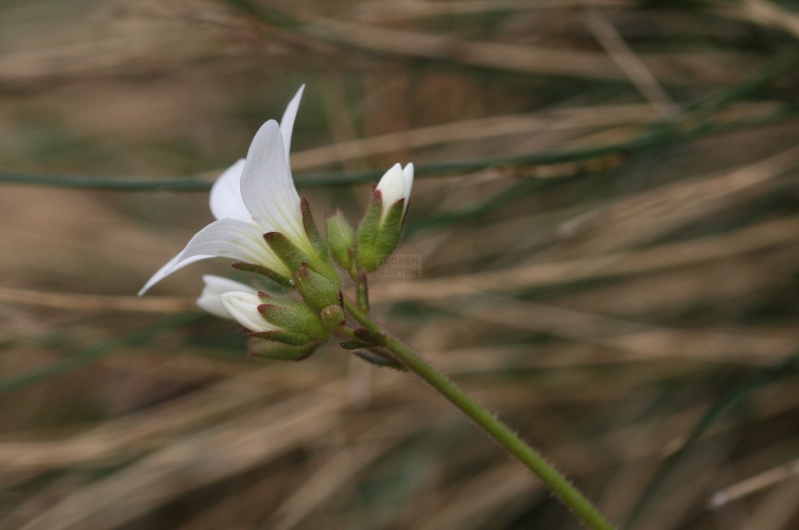 Die Blütenstängel sind wenigblütig, aufrecht, rispig verzweigt. Die Kronblätter sind weiß mit grünen Adern, 10–17 mm lang. Die Kelchblätter sind drüsig behaart.