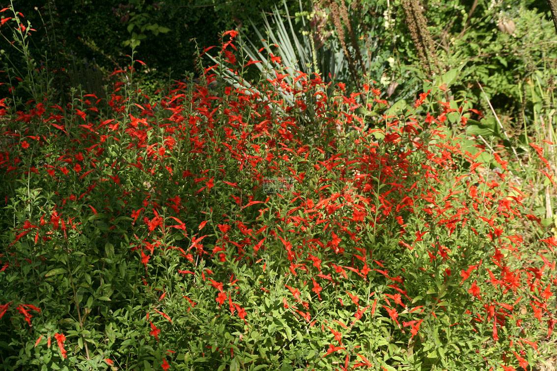 Es ist eine dekorative Blühstaude, die sich über Wurzelschösslinge ausbreitet und so im Laufe der Zeit einen Staudenteppich bildet. Die röhrenförmigen Blüten sind leuchtend rot, bis 3,8 cm, mit langen aus dem Kelch heraus ragenden Staubfäden und vier Kelchblättern. Die grünen Blätter sind länglich bis oval, behaart und leicht gesägt.